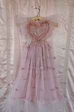 This design features my signature heart bodice with intricate beading and a mix of whimsical details and materials.