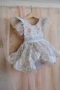 Featuring upcycled vintage floral fabric, velvet bottoms, delicate sheer ruffle details and lace details. A lovely one of a kind piece of heirloom quality.