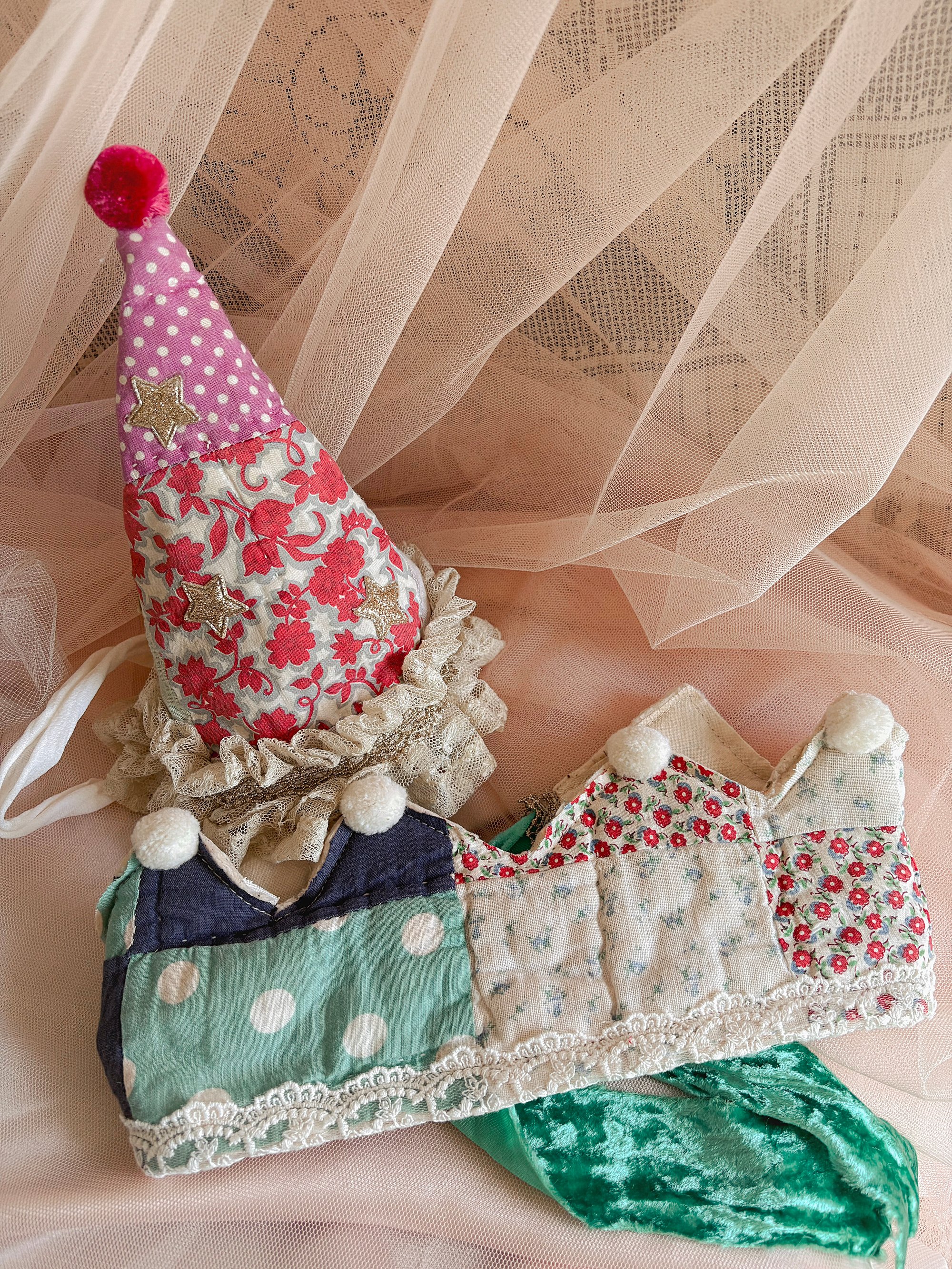 These whimsical crowns are handmade using vintage quilts. Topped off with lace and pompom details for added whimsy.
