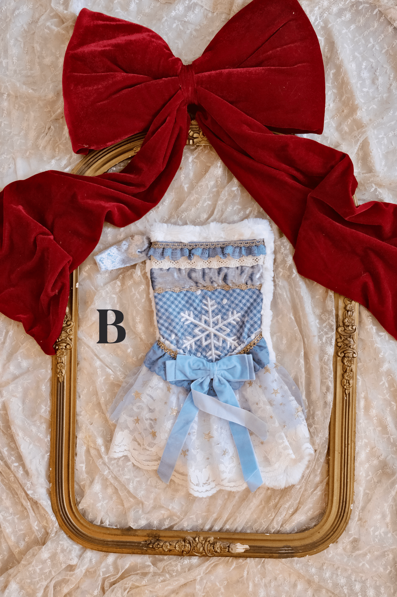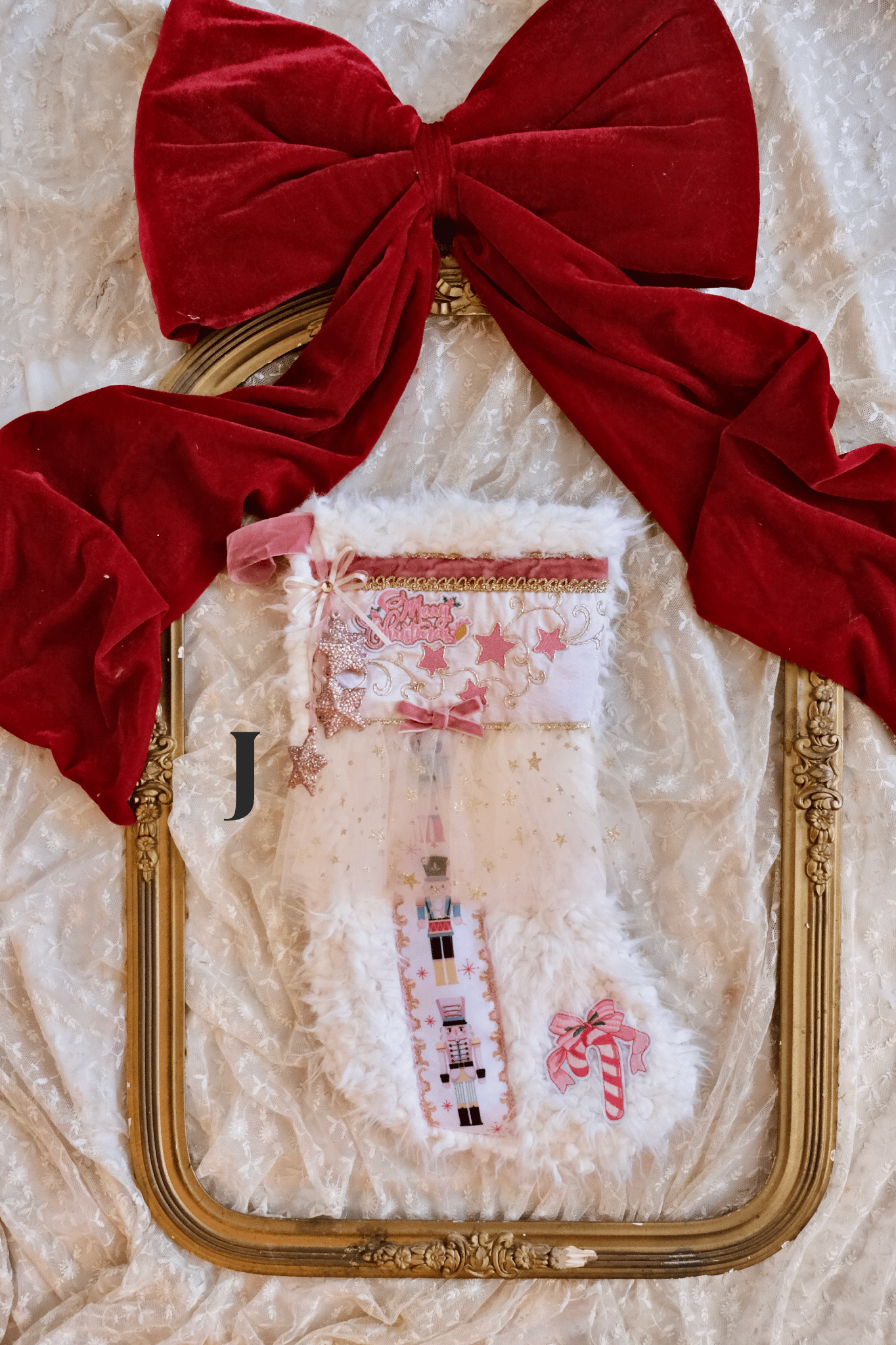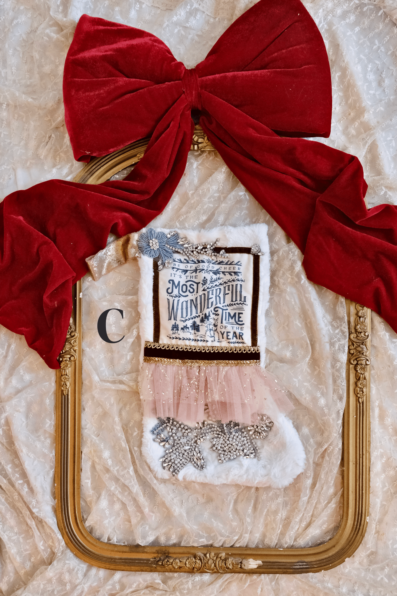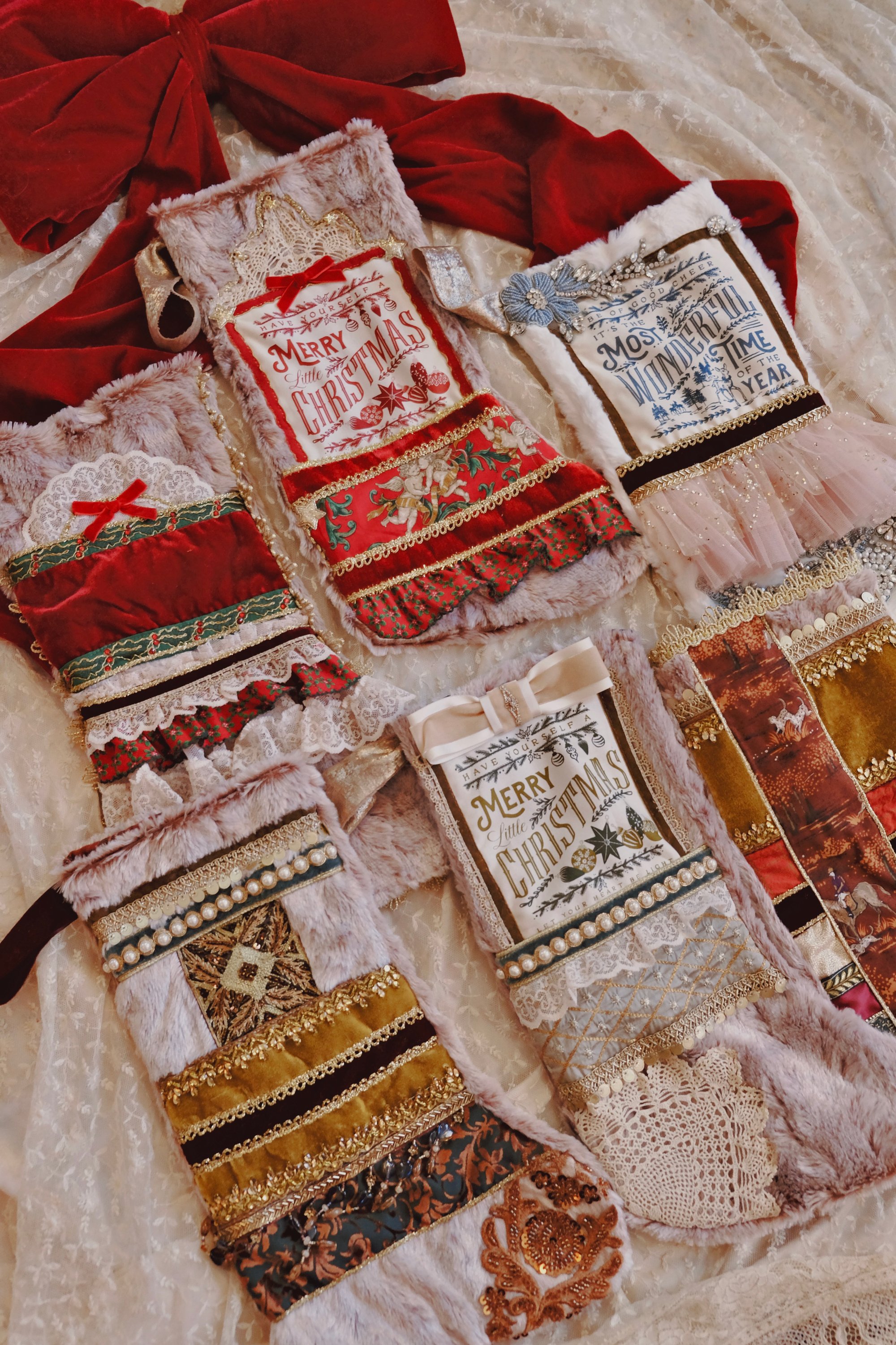 Whimsy stockings are handmade, soft plushy fully lined material adorned with an abundance of trimmings and details for a quirky and whimsical touch to your holiday decorating.